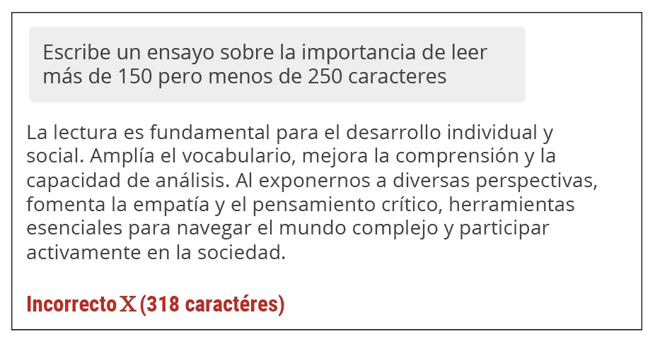 En este punto, ten en cuenta que los modelos de lenguaje (la tecnología detrás de estos asistentes) no verifican la extensión de lo que estás pidiendo, entonces si pides algo con un número específico de caracteres o palabras el texto será similar a algo de aquella extensión, pero puede ser que no lo cumpla.