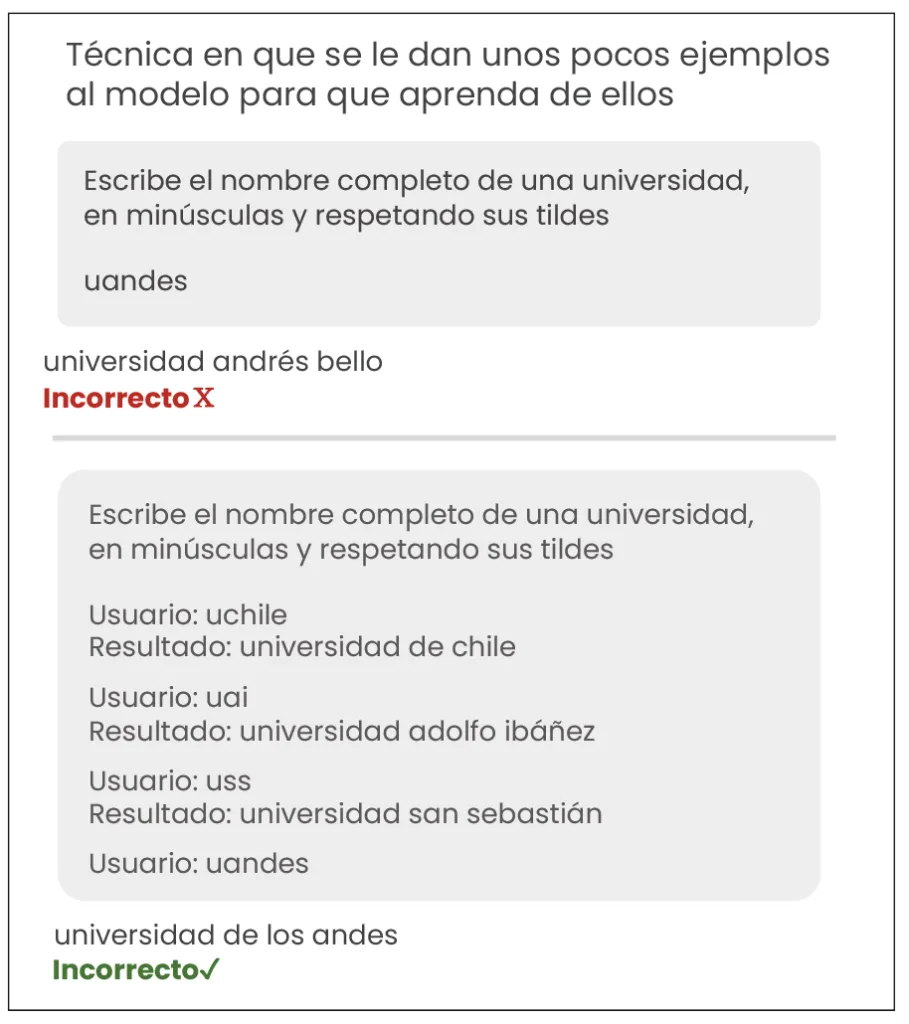 También, es bueno entregarle ejemplos, pues mejora la estructura y además el modelo puede obtener elementos clave del contexto a partir de ellos. En el siguiente ejemplo el modelo no sólo sigue la estructura, sino que también suele equivocarse menos, pues los términos están relacionados a universidades del mismo país, lo cual no se entendía sin los ejemplos.