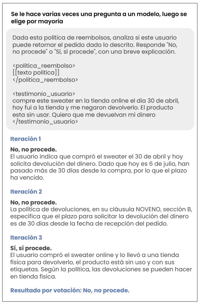 En este ejemplo, se le pidió una evaluación en base a una política de reembolsos, y en 2 de 3 ocasiones determinó un resultado, ¿habría sido correcto tomar la decisión con sólo una de las iteraciones?
