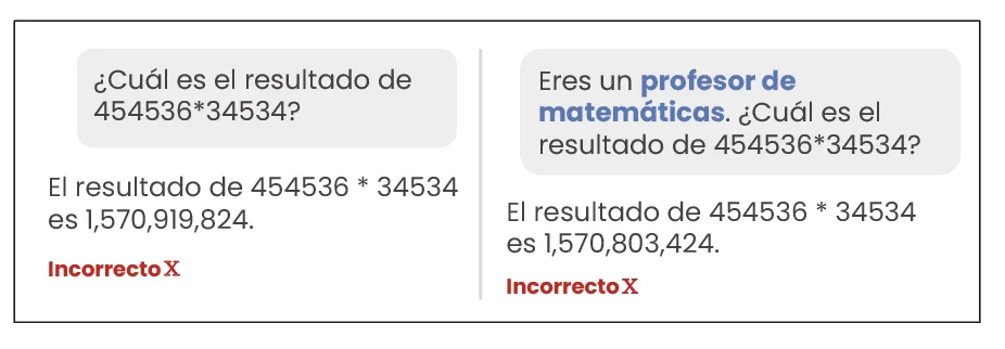 Sin embargo, no esperes que “soy profesor de matemáticas” arregle la aritmética u otros errores relacionados a la precisión del modelo: el rol modifica la personalidad y estilo, pero no garantiza la exactitud en cálculos u otros hechos duros.