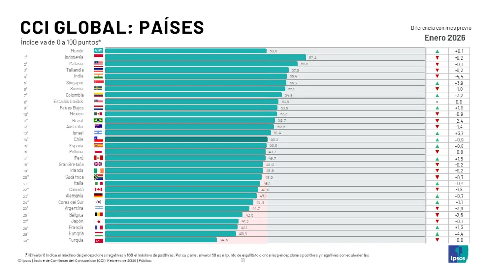 Santiago, febrero de 2026. La compañía de investigación de mercados Ipsos lanza su último informe “Índice de Confianza del Consumidor” (CCI, por sus siglas en inglés), donde se recoge la percepción de más de 20 mil personas en 30 países para medir el nivel de optimismo de los consumidores en relación con la situación de las economías locales, las finanzas personales, los ahorros y las condiciones para invertir.