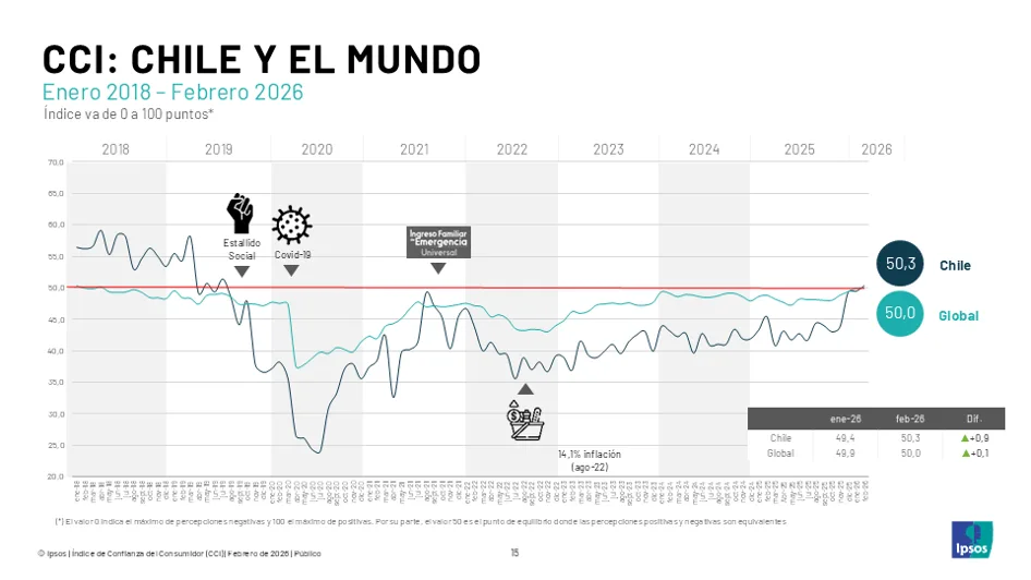El Índice de Confianza del Consumidor de Chile en febrero marca 50,3 puntos, alcanzando el punto de equilibrio en que las percepciones positivas y negativas sobre el estado de la economía se equiparan. Con ello, se posiciona en zona de optimismo por primera vez desde julio de 2019, hace más de seis años atrás.