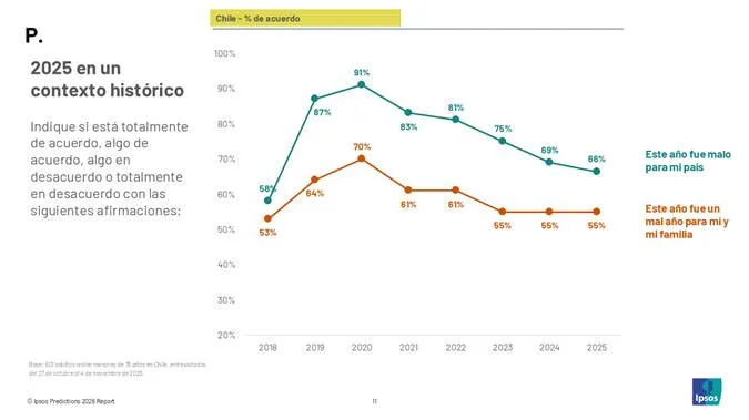 Dos de cada tres personas (66%) en Chile consideran que 2025 fue un mal año para el país, la proporción más baja en siete años, previo al estallido social y los años de pandemia, cuando un 58% calificó el año de manera negativa. Además, por tercer año consecutivo el 55% de los encuestados chilenos evalúa este año como malo para ellos y su familia, similar al registro de 2018 (53%)