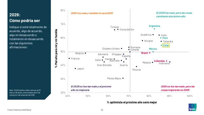 Los encuestados de Chile se ubican con el tercer mayor nivel de optimismo, entre 30 países, en sus proyecciones de que el próximo año será mejor que 2025. Además, dos de cada tres encuestados nacionales creen que la economía global será más sólida para 2026