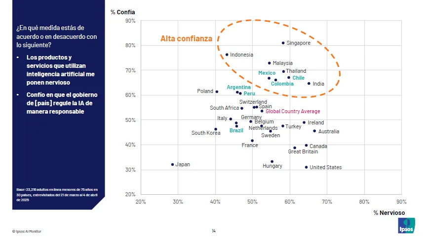 Su más reciente Monitor de IA, que recoge la percepción en 30 países, revela diferencias regionales en el nivel de entusiasmo por los avances de la inteligencia artificial, la confianza en un uso responsable y las expectativas de impacto futuro.