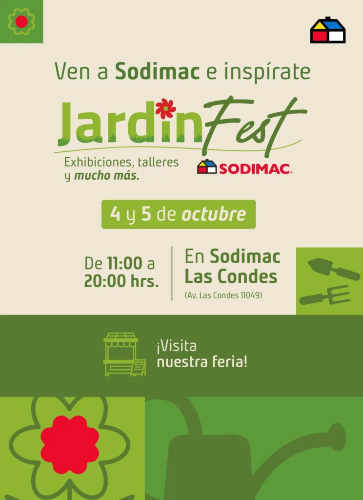 “Jardín Fest” ofrecerá un espacio de encuentro único con más de 40 stands, sobre 20 charlas para el bueno uso de productos y tendencias, y 40 marcas con las últimas novedades y descuentos especiales en jardín, terrazas, piscinas y campings. Esta actividad dará una especial presencia a los emprendedores para impulsar su desarrollo, a lo que se agregan productos de distintos proveedores de Sodimac.